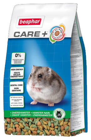 A Care+ törpehörcsög-eledel a benne lévő állati proteineknek és a magas zsírtartalomnak köszönhetően tökéletesen kielégíti a a törpehörcsögök energia-szükségletét. A tápdarabkák úgy lettek kialakítva, hogy az állat könnyedén el tudja raktározni a pofazacskójában. Minden darab azonos összetevőkből áll (All-in-One), így elkerülhető, hogy a hörcsög válogasson, és ezáltal valamilyen tápanyagból hiányt szenvedjen. A táp megfelelő keménységű ahhoz, hogy hozzájáruljon a fogak egészséges koptatásához. Fő összetevői közé tartoznak a zöldtea-kivonat az immunrendszer támogatásáért, echinacea, spirulina, E-vitamin, yucca schidigera, ásvány kelát a jobb felszívódás érdekében, FOS és MOS a bélflóra védelméért, omega3 és 6 zsírsavak.