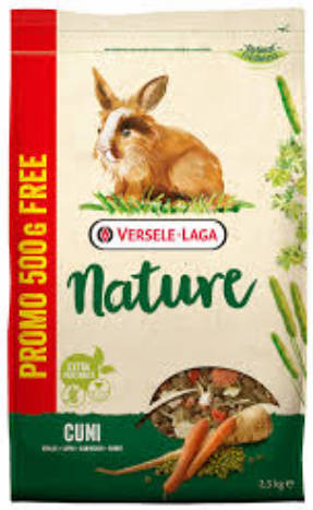 Teljes értékű eledel nyulaknak a legújabb ismeretek szerint elkészítve. Nem tartalmaz gabonaféléket, de több aszalt zöldség van benne, tele vitaminokkal. Fűből, fűszernövényekből és zöldségekből készült rostban gazdag pellet – a nyulak természetes tápláléka. A Versele-laga cuni nature kemény, ropogós darabokat is tartalmaz a fogcsikorgatás elősegítésére.