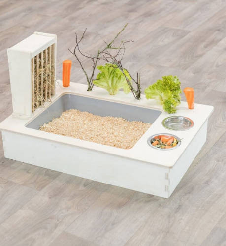 Ez az aranyos nyúletető 2 tállal és szénatartóval praktikus kiegészítő rágcsálók élőhelyéhez: 2 rozsdamentes acél tállal van felszerelve, amelyekben víz és gabonafélék vagy zöldségek tárolhatók, ezenkívül még kis kiegészítő nyílások vannak elhelyezve az ágak és zöldségek számára.