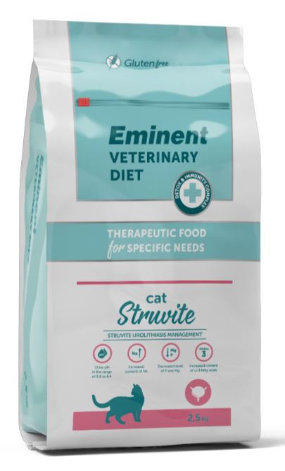 A struvit urolithiasisban (struvit kőben) szenvedő betegek kezelésének nagyon fontos része a megfelelő táplálék kiválasztása, hogy a vizelet pH-ját olyan szinten tartsák, amelyben a struvit kristályok feloldódnak. Ezen kívül a tápnak a struvit alkotóelemek csökkentett szintjét kell tartalmaznia, hogy megakadályozza azok újraképződését. Ezeknek a különleges követelményeknek felel meg a teljesértékű Eminent Diet Cat Struvite macskatáp. A táp másik funkcionális alkotóeleme az áfonya, amely proanthocianidineket tartalmaz, amely a baktériumok felületéhez kötődik, és így megakadályozza azok húgycső falához való kötődését. Ezáltal elősegítik az egész kiválasztó rendszer bakteriális fertőzéseinek megelőzését.