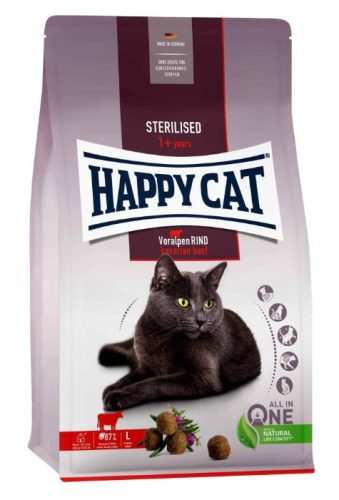 A Happy Cat Sterilised Voralpen-Rind (alpesi marha) kifejezetten az érzékeny, felnőtt macskák számára lett kifejlesztve, akiknek ivartalanítás után kiváló, tápláló eledelre van szükségük.