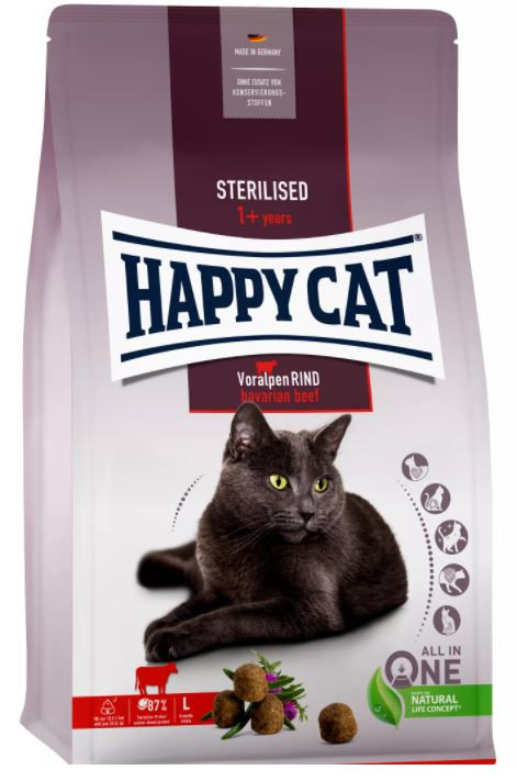 A Happy Cat Sterilised Voralpen-Rind (alpesi marha) kifejezetten az érzékeny, felnőtt macskák számára lett kifejlesztve, akiknek ivartalanítás után kiváló, tápláló eledelre van szükségük.