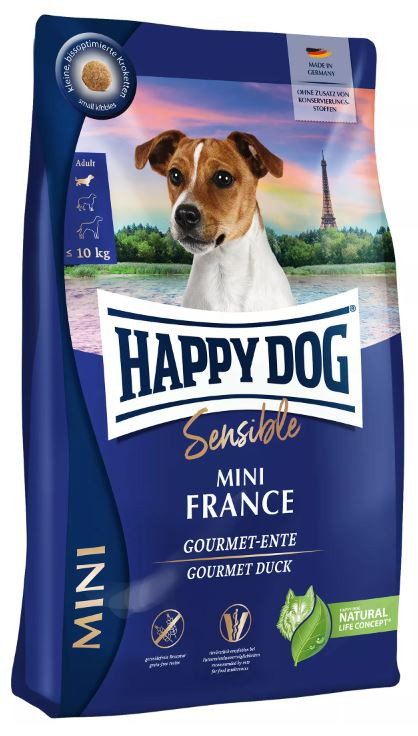 A Happy Dog Mini France szuper-prémium teljes értékű eledel tápláló kacsával és finom burgonával kényezteti kutyáját.