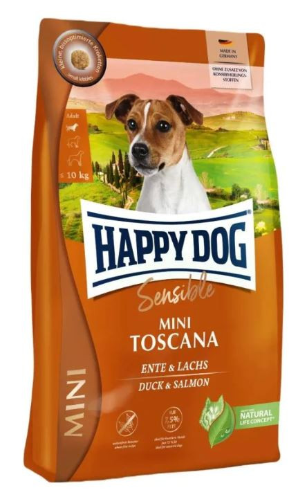 A Happy Dog Mini Toscana eledellel elkényeztetheted kutyusodat a finom kacsa, az alacsony zsírtartalmú tengeri hal és a mediterrán fűszernövények különösen kiegyensúlyozott kompozíciójával.