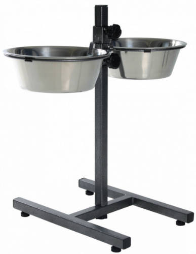 A kalapácslakkal borított állvány formájának és gumitalpainak hála csak nehezen csúszik vagy mozdul el. A tálak magassága állítható, beillesztésük, kivételük egyszerű.